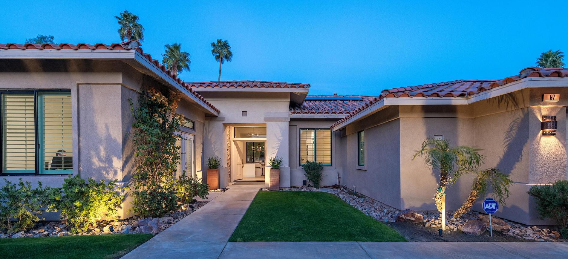 Welcome to luxe living in the exclusive 66-home gated community of San Marino. This brand new remodeled 3 Bedroom 2 Bath home is sure to impress. Upon entry, you immediately notice the attention to tasteful detail with new flooring/baseboards throughout and freshly painted interiors. The open-concept kitchen/living/wet bar area serves as the central social heart of the home. The 2023 remodeled kitchen is a chef’s dream, featuring luxury appliances, new fixtures, tiled backsplash, exhaust hood, newly painted cabinetry and new quartz counters throughout. Additional upgrades include lighting fixtures, LED lighting, recessed pot lights, under cabinet lighting, new ceiling fans, stunning new bathrooms, exterior lighting, stoned fireplace, new mantle, new wet bar with fridge, sink and shelving, laundry room, and more… The large primary bedroom with en-suite bath is complete with spacious shower, spa tub, and onyx countertops. The attached bonus space currently used as a private office, could be easily converted into a den, home gym, or additional walk-in closet. Outside is paradise with a touch of elegance on an over-sized lot with your pebble tech pool/spa, conversation fire-pit area, and mature landscaping with luscious citrus trees. The home is equipped with owned Solar, newer Milgard Windows, and high efficiency Trane A/C units, ensuring you stay comfortable all year round. HOA includes community amenities; pool/spa, tennis and pickleball courts on their way, front yard maintenance, and cable TV/internet. Offered fully furnished, turnkey.