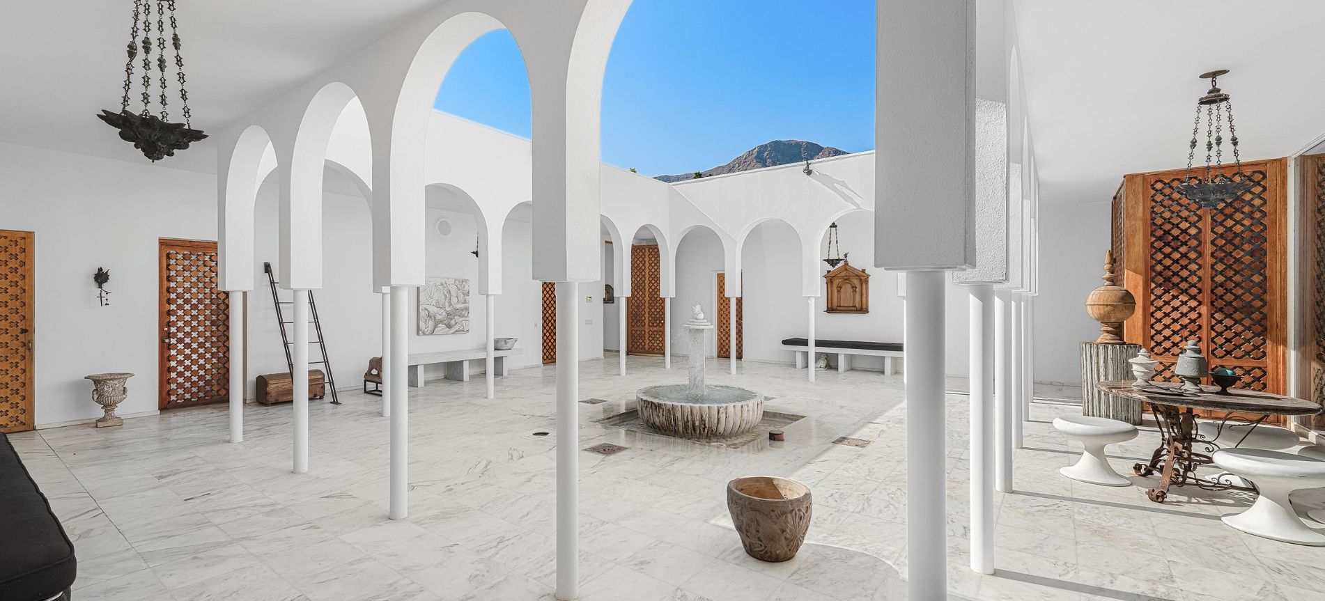 A rare and extraordinary offering designed in 1957 by renowned architects Henry Eggers & Walter Wilkman for Thomas B. Davis, White Shadows stands as one of the desert’s most revered architectural masterpieces in Thunderbird Heights. This Moroccan-influenced villa is a timeless study in elegance and sophistication. Set behind private gates on an elevated acre, the estate boasts panoramic views of the valley floor and surrounding mountains. A sun-drenched courtyard, highlighted by a striking fountain, serves as the home’s dramatic centerpiece, seamlessly blending indoor and outdoor living.